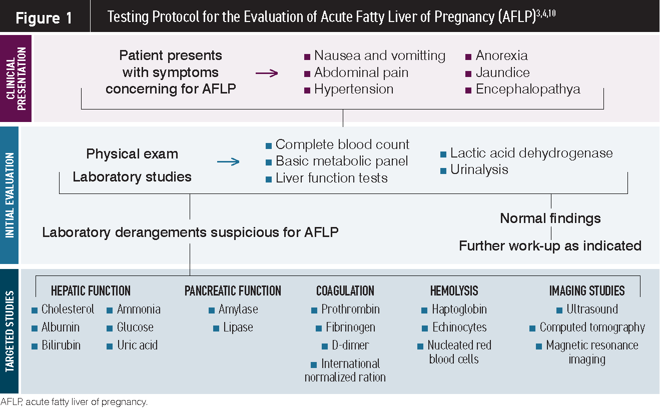 Una de estas características clínicas, náuseas y vómitos de inicio reciente en el tercer trimestre, a menudo se asocia con AFLP y amerita una evaluación adicional. El algoritmo de prueba de la Figura 1 se puede utilizar para facilitar la evaluación en mujeres que se presentan con sospecha de AFLP. Si la preocupación clínica por AFLP sigue siendo alta después de la evaluación inicial de laboratorio, se pueden obtener más pruebas de confirmación. Estas pruebas están disponibles en la mayoría de los hospitales y se enfocan en identificar disfunción hepática y hematológica, que son las características distintivas de la AFLP.