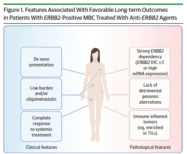 Por otro lado, 3 características patológicas relacionadas con la respuesta a largo plazo son la alta expresión de ERBB2, la ausencia de aberraciones genómicas perjudiciales y la activación inmunitaria antitumoral.